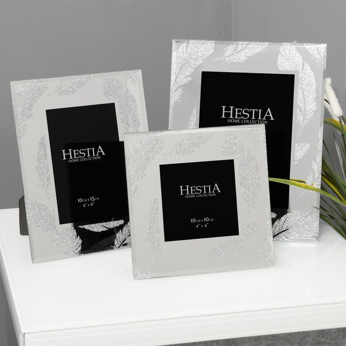 A silver feather, 4" x 6" portrait photo frame, with silver glitter detailing. This contemporary photo frame brings a modern twist on the classic glass frame design.