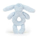 A treat for tiny hands, Bashful Blue Bunny Ring Rattle can be grabbed by its soft paws, long lop ears or ring-shaped tummy. When given a gentle shake it will sound the rattle inside, much to baby’s delight! Crafted in a soft, pale blue coloured fur made from recycled fibres featuring a Bashful Bunny pink suedette nose and embroidery eyes.