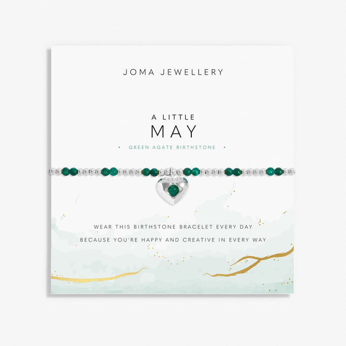 Let us introduce you to our Birthstone A Little bracelets - now with an elevated design! Featuring a pretty gemstone-set heart charm and threaded with alternating silver-plated beads and semi-precious Green Agate gemstones, our Birthstone A Little 'May' bracelet in silver plating is sure to make the birthday girl’s stack shimmer. Wrapped around a coloured limewash card with gold foil detailing, this little style makes the most wonderful gift, whether it’s gifted alone or alongside the rest of our birthstone collection!