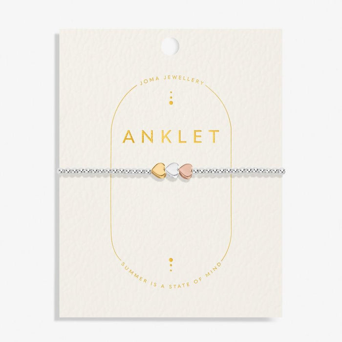 With its silver-plated beads and trio of heart charms, the three tone heart anklet in silver, gold and rose gold plating is the perfect addition to your al fresco accessory lineup.
