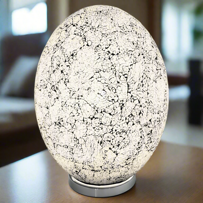 A beautiful piece of lighting that lightens up the room and the occasion with its unique sense of style from first glance. The Large Mosaic Egg Lamp gives a soft mood light while creating a magical atmosphere and adding a romantic feel to any room. Each Lamp is hand blown decorated glass. This lamp would be an asset to any bedroom or living room or make a great gift for someone special.