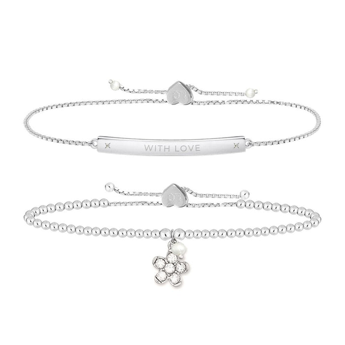 Make your flower girl feel extra special with the Life Charms Occasion Gift Box - Flower Girl. This lovely set from the Occasion Gift Boxes collection is designed to show love and appreciation, featuring two silver-plated bracelets that are both stylish and meaningful. One is an adjustable bangle bracelet engraved with the sentiment 'With Love', symbolising the warmth and affection you hold for her. The other is a beaded adjustable bracelet adorned with delicate silver charms, adding a whimsical touch to her ensemble.