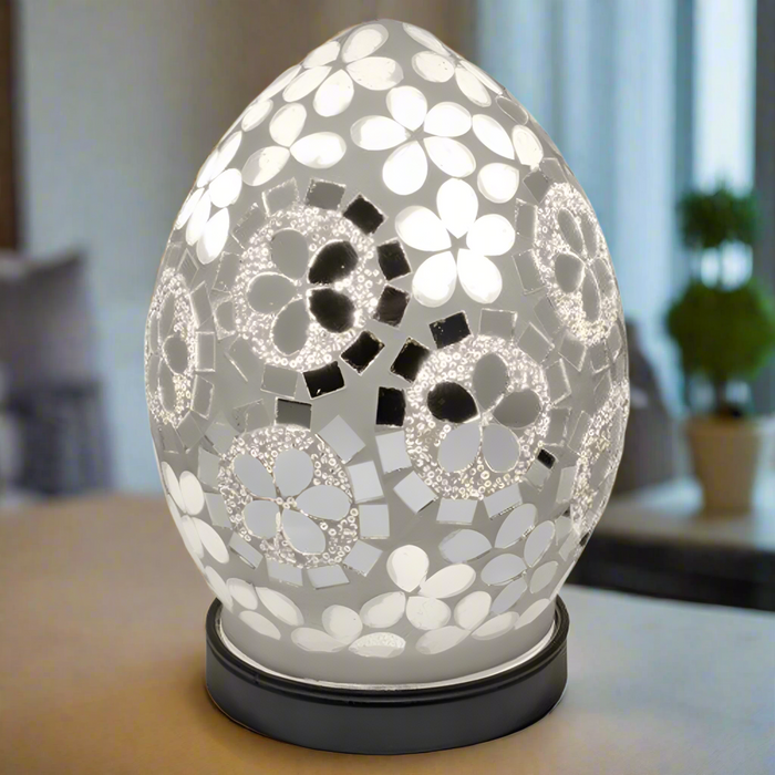 A beautiful piece of lighting that lightens up the room and the occasion with its unique sense of style from first glance. The Mini Mosaic Egg Lamp gives a soft mood light while creating a magical atmosphere and adding a romantic feel to any room. Each Lamp is hand blown decorated glass. This lamp would be an asset to any bedroom or living room or make a great gift for someone special. They look just as fabulous switched off too!